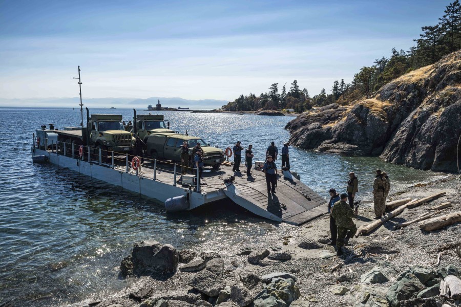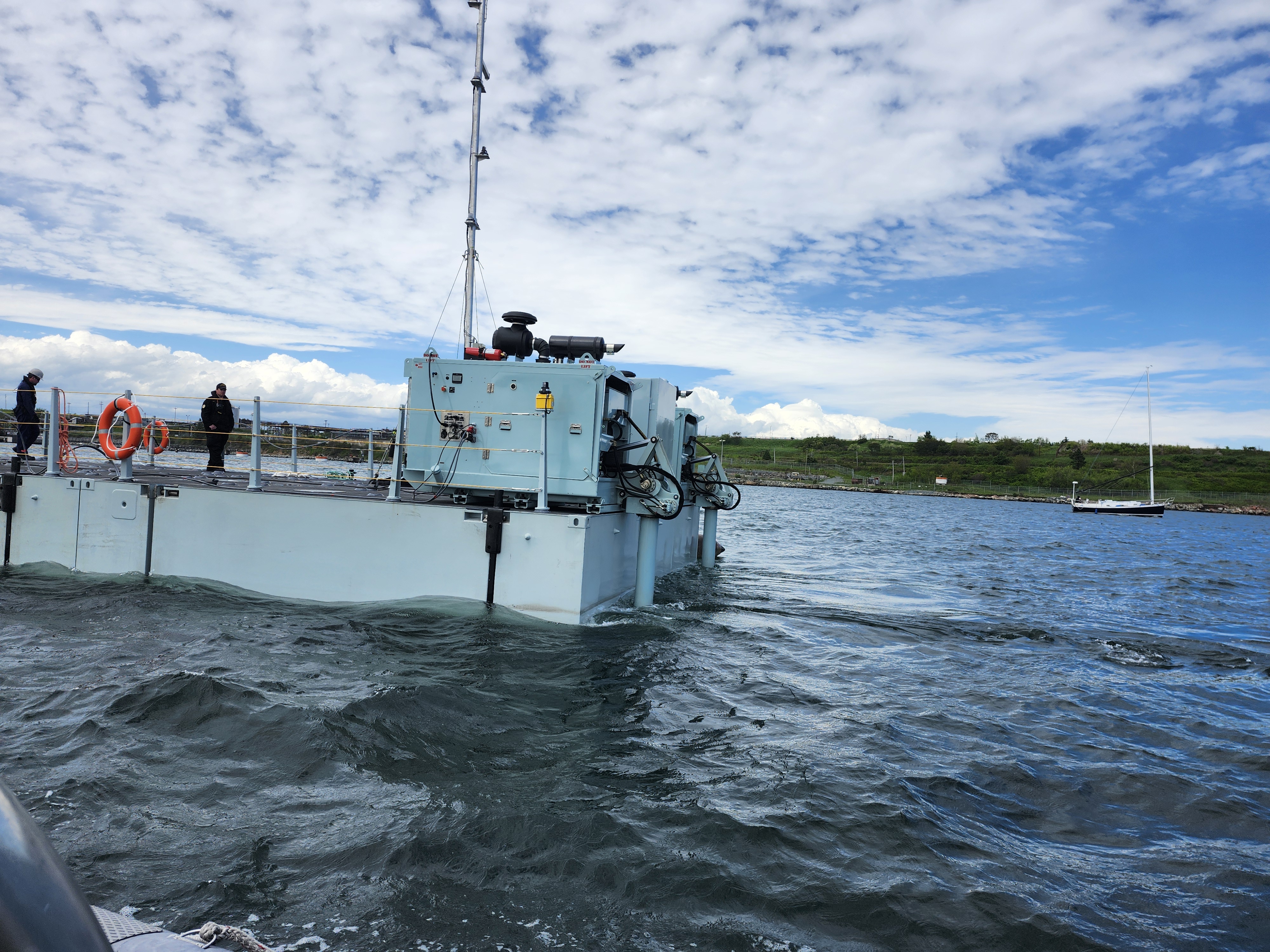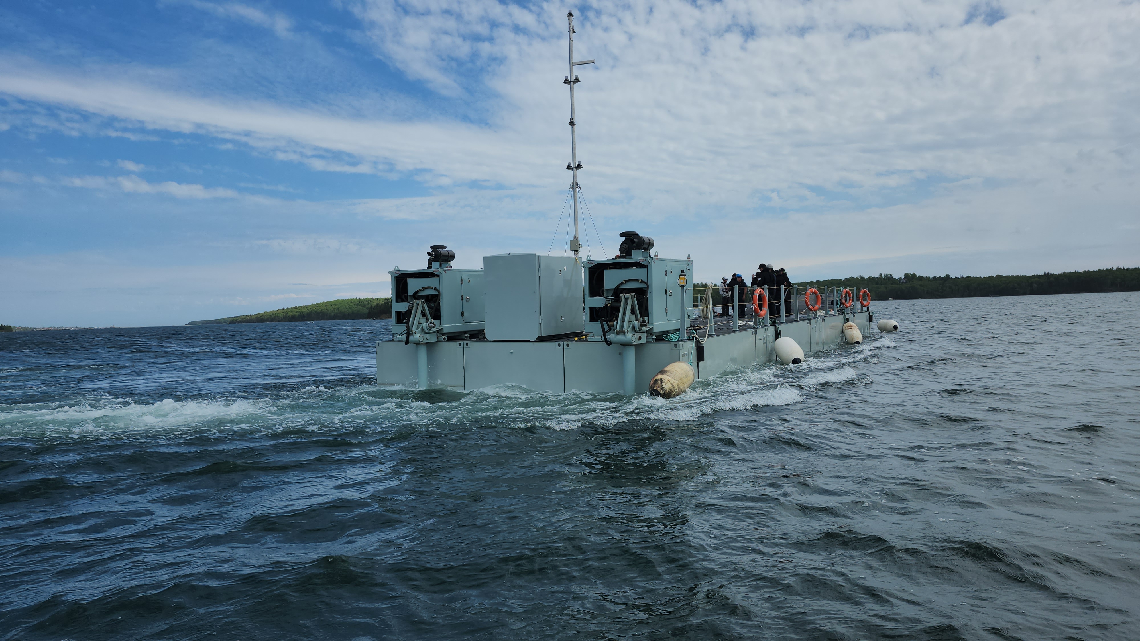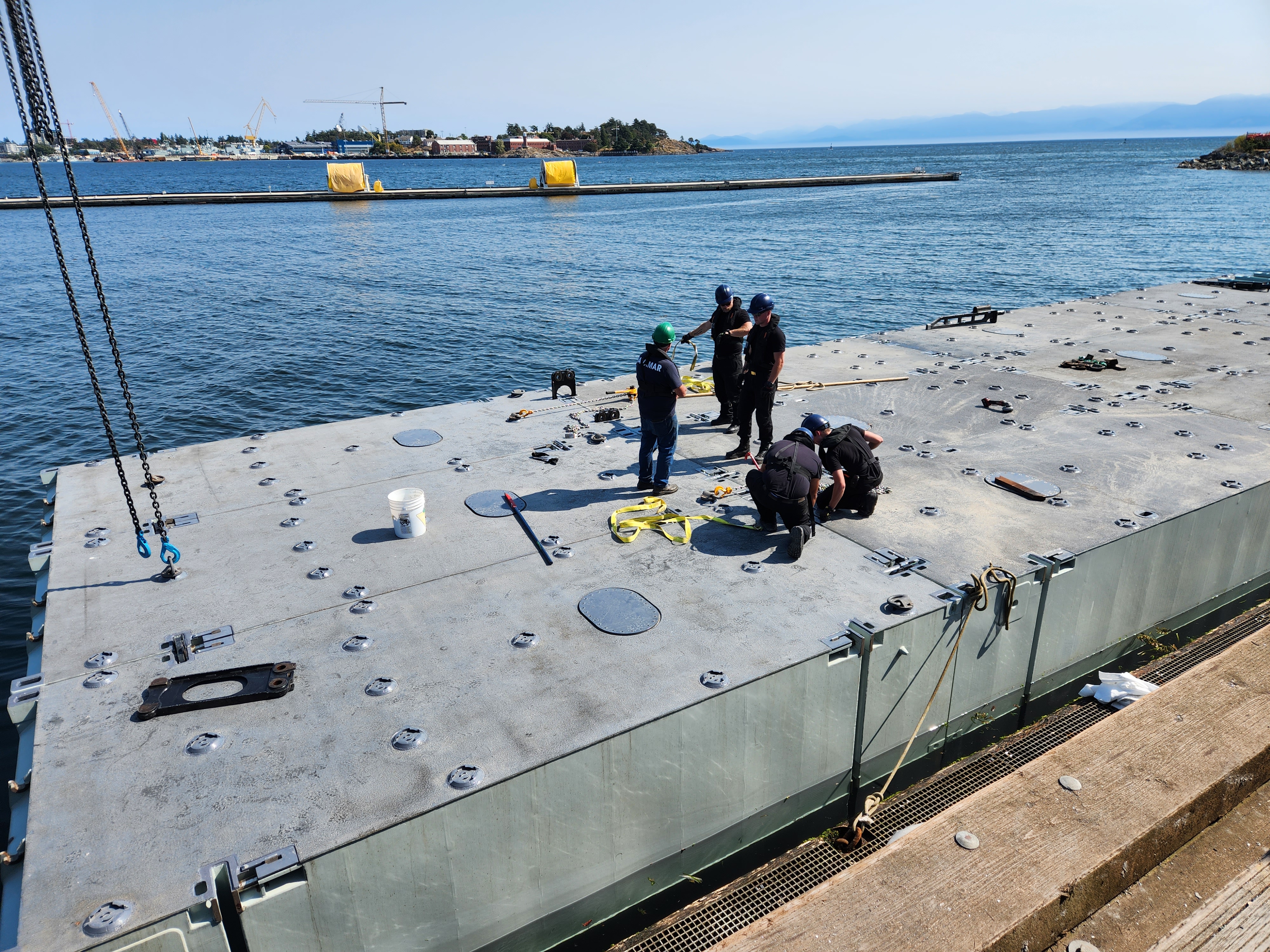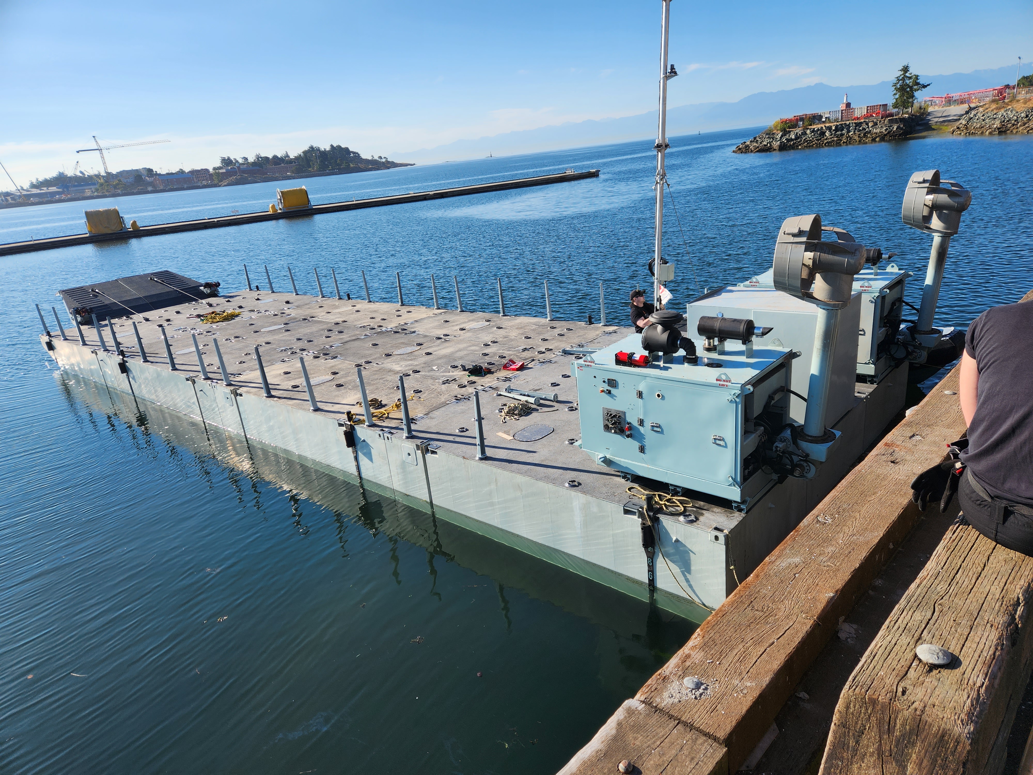 Le bureau de gestion de projet du navire de soutien interarmées a participé à un test d’adaptation en usine dans l’eau réussi du système de connecteurs Sea to Shore. Construits par Navamar dans le port de Montréal, ces systèmes donneront à la future classe Protecteur une capacité amphibie importante. L’essai a démontré la conformité aux exigences clés telles que la vitesse maximale sous charge, le rayon de braquage et les délais d’assemblage dans un environnement réel. Les connecteurs Sea to Shore pourront transporter 50 tonnes de fret à une vitesse de 5 nœuds dans des ports abrités où le navire ne peut accoster. Ses capacités d'échouage, avec rampe de roulage, offriront à la Marine royale canadienne (MRC) un degré élevé de flexibilité pour soutenir l'aide humanitaire, les secours en cas de catastrophe et/ou les opérations conjointes à terre. Les barges de ponton modulaires sont assemblées dans l'eau avec la possibilité de charger n'importe quoi, que ce soit des véhicules ou des conteneurs maritimes de fournitures, puis de les transporter ensuite à terre. Une fois que les composants du système auront été sablés et peints conformément aux schémas de couleurs des navires de la MRC, le système sera livré à Esquimalt au début de la nouvelle année, suivi de la formation initiale des cadres et des essais d'acceptation au printemps.
