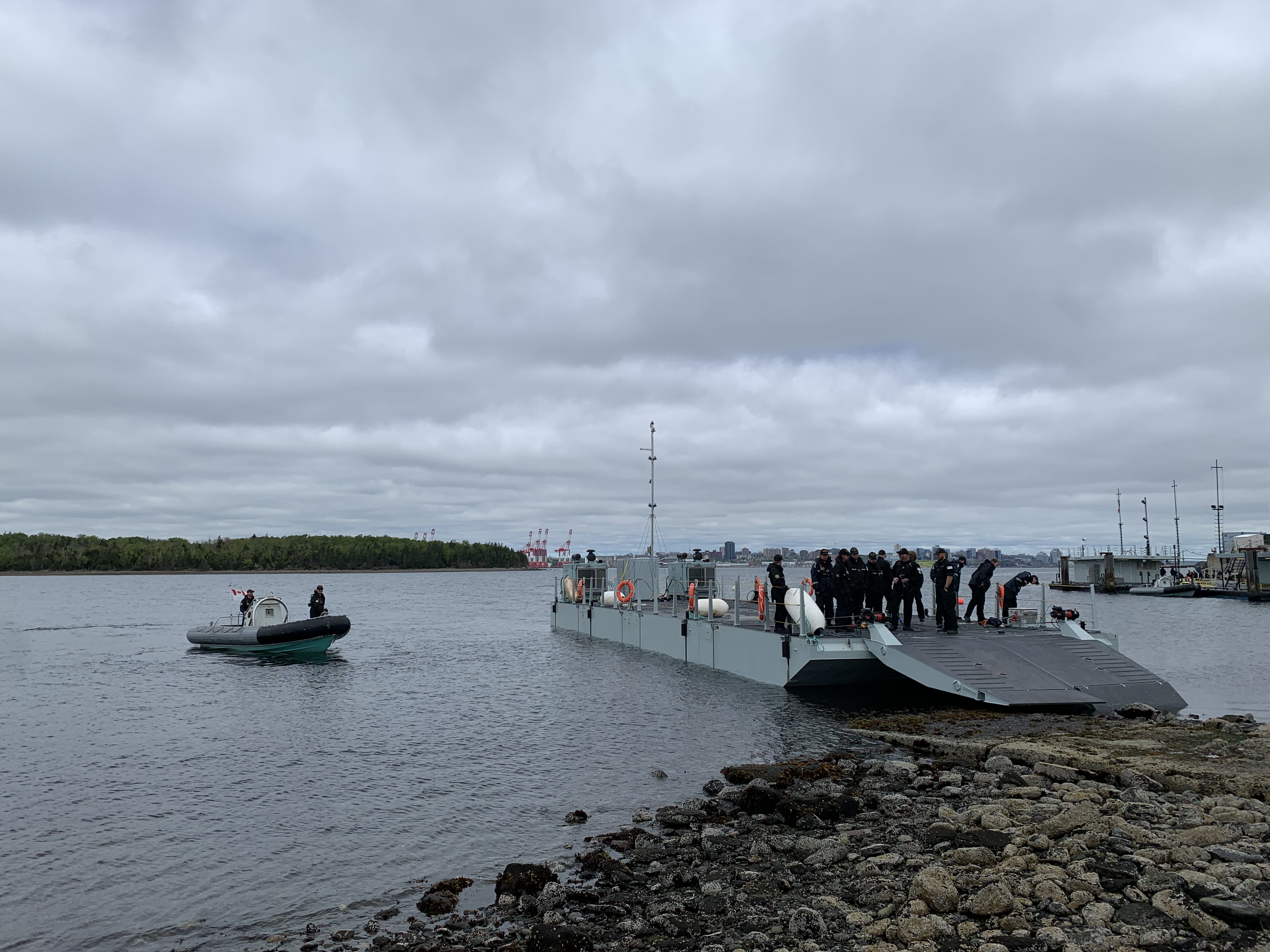Le bureau de gestion de projet du navire de soutien interarmées a participé à un test d’adaptation en usine dans l’eau réussi du système de connecteurs Sea to Shore. Construits par Navamar dans le port de Montréal, ces systèmes donneront à la future classe Protecteur une capacité amphibie importante. L’essai a démontré la conformité aux exigences clés telles que la vitesse maximale sous charge, le rayon de braquage et les délais d’assemblage dans un environnement réel. Les connecteurs Sea to Shore pourront transporter 50 tonnes de fret à une vitesse de 5 nœuds dans des ports abrités où le navire ne peut accoster. Ses capacités d'échouage, avec rampe de roulage, offriront à la Marine royale canadienne (MRC) un degré élevé de flexibilité pour soutenir l'aide humanitaire, les secours en cas de catastrophe et/ou les opérations conjointes à terre. Les barges de ponton modulaires sont assemblées dans l'eau avec la possibilité de charger n'importe quoi, que ce soit des véhicules ou des conteneurs maritimes de fournitures, puis de les transporter ensuite à terre. Une fois que les composants du système auront été sablés et peints conformément aux schémas de couleurs des navires de la MRC, le système sera livré à Esquimalt au début de la nouvelle année, suivi de la formation initiale des cadres et des essais d'acceptation au printemps.